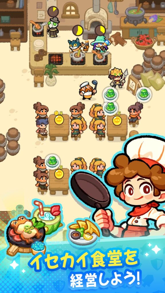 『イセカイ飯 TD』は、かわいいミニキャラの英雄たちと共にモンスターを撃退し、手に入れた食材でレストランを経営するディフェンス×経営シミュレーションです。