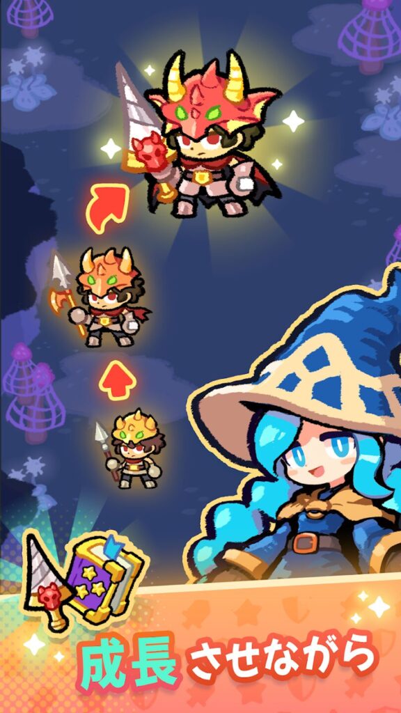 バトルは直感的な操作で遊べるローグライク形式で、同じキャラを重ねて強化するマージシステムが特徴です。