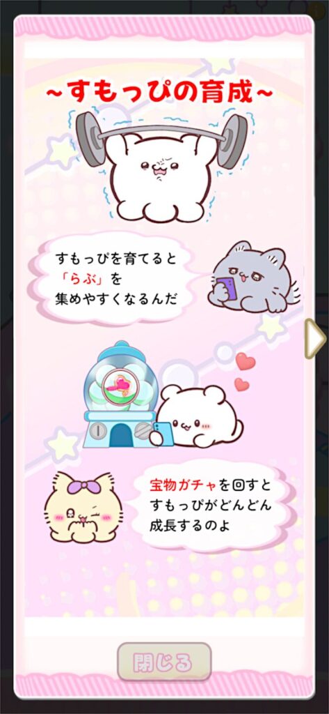 宝物ガチャを引くとすもっぴが育成されて、ハートの発生間隔が短くなったり、ゲージの上昇量が増えたりします。