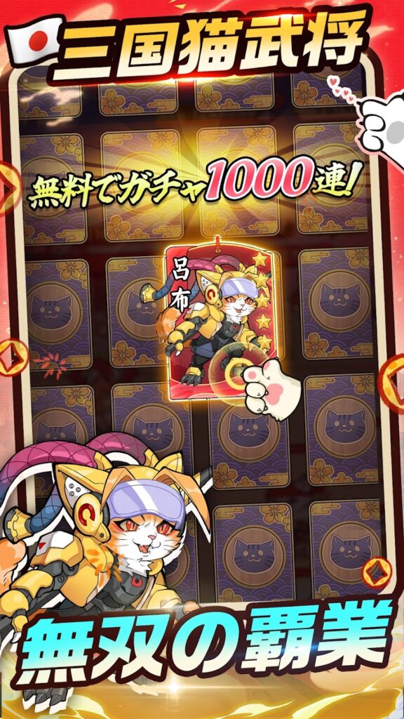 三国志の英雄たちが可愛い猫の姿になって戦う放置系カードバトルRPGで、ガチャ確率10%、さらに無料の猫箱からも最高レアが手に入るという驚きの仕様です。