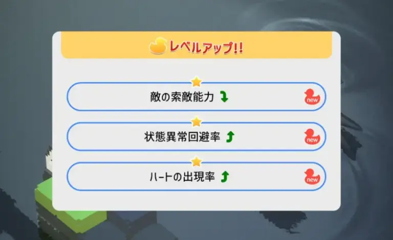 カモを倒して経験値を貯めるとレベルアップし、3つの強化から1つを選べます。